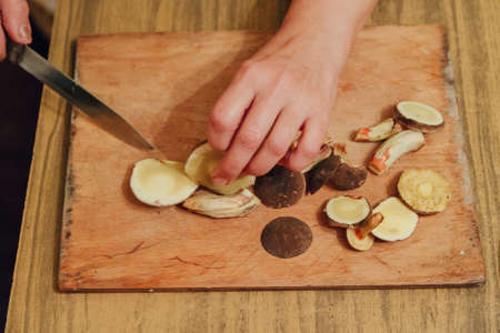 Knife in hand. Girl cleans mushrooms. Many Autumn plants