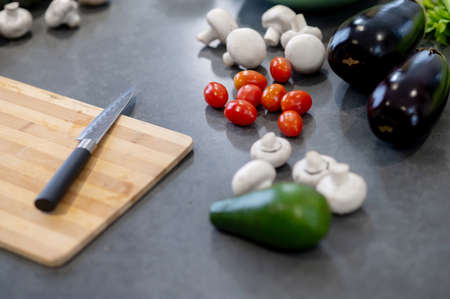 closeup of man hands african american cuts vegetables fry salad pepper, mushrooms, tomato in kitchen recipe book on the table .vegan healthy food.