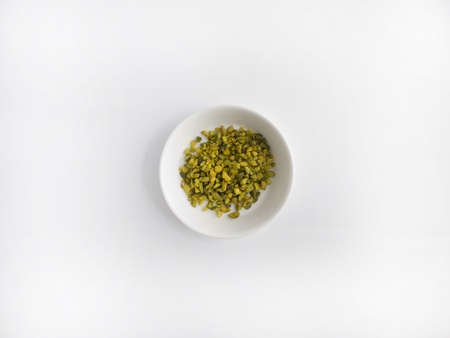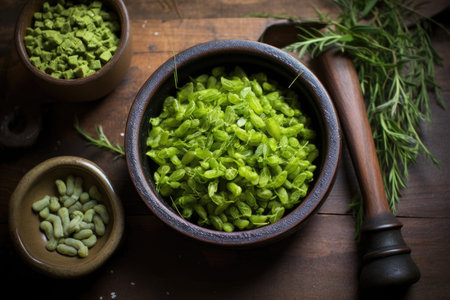 a top view of a wasabi pea snack in a rustic bowl, created with generative ai