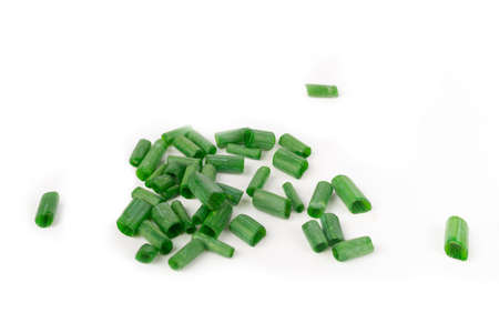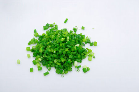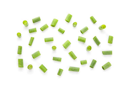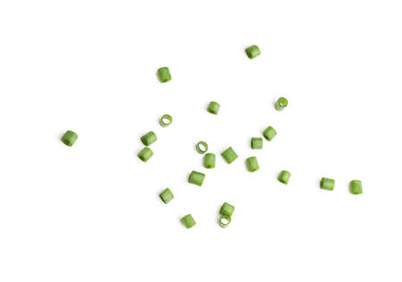 Chopped chives top down on white background fine rings arranged in clean diagonal gradient from dense to sparse for herb ingredient and pattern themes