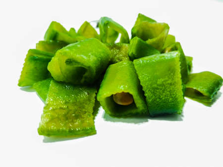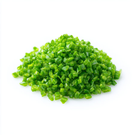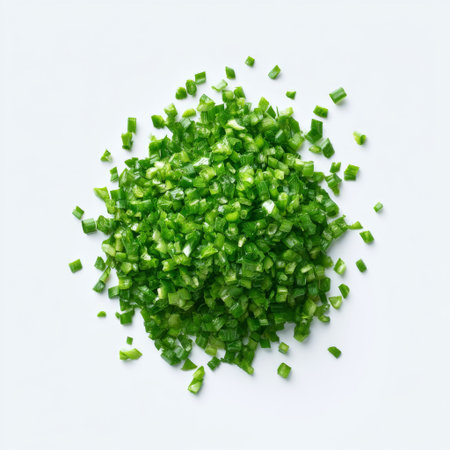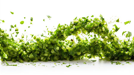 This image showcases a vibrant pile of freshly chopped green vegetables arranged neatly on a clean white background, perfect for culinary inspirations.