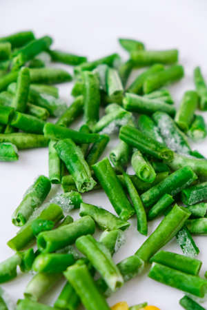 Frozen vegetables food background of yellow corn, green beans. Harvest Food preservation for winter. Veganism, vegetarian healthy eating.