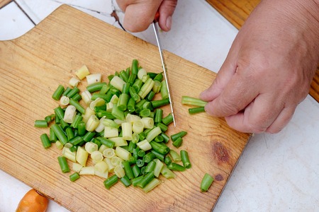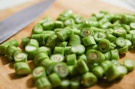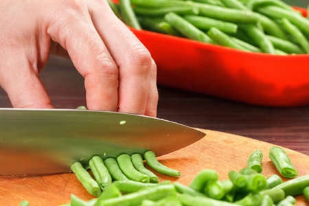 Women hand with a knife cutting raw green beans on a wooden kitchen board