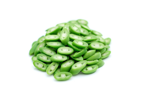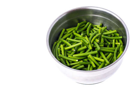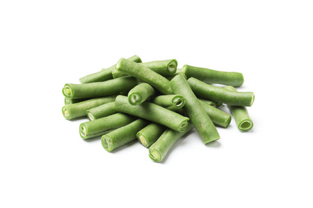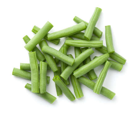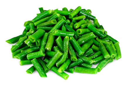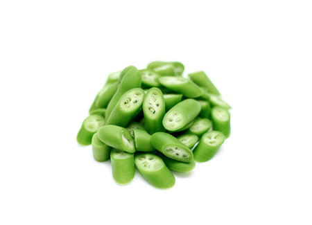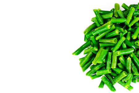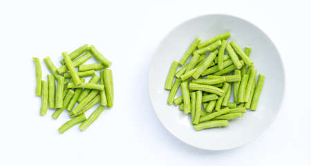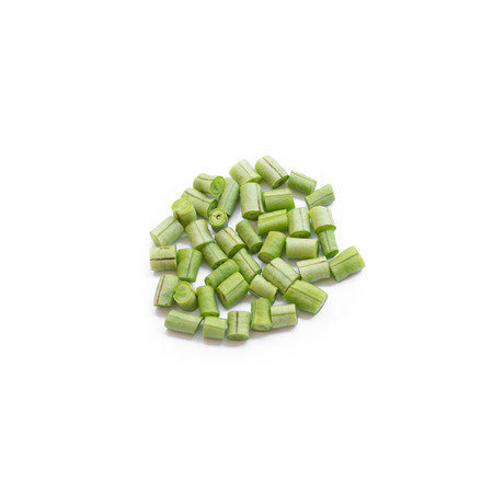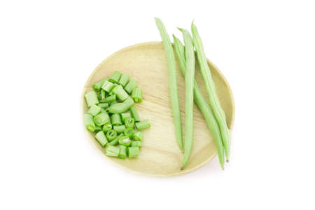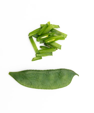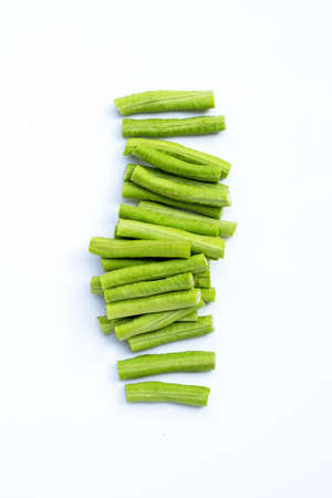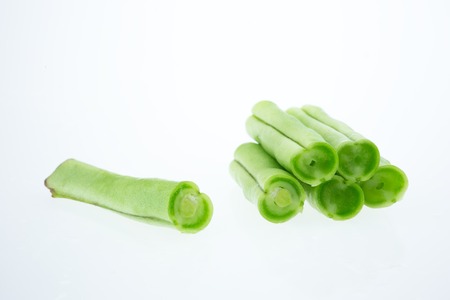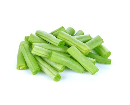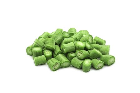 Raw organic yard long bean chopped on white isolated background in closeup macro concept. Fresh yard long bean have sweet taste and crisp, high nutrition and vitamins. Food and vegetable concept.