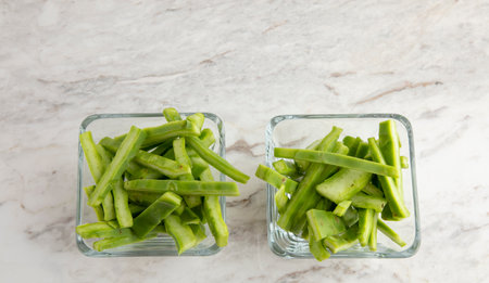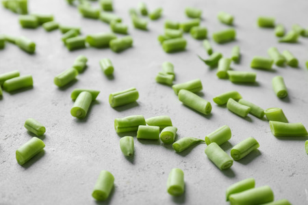 Chopped Frozen Green Beans on Stone Background Flat Lay and Top View