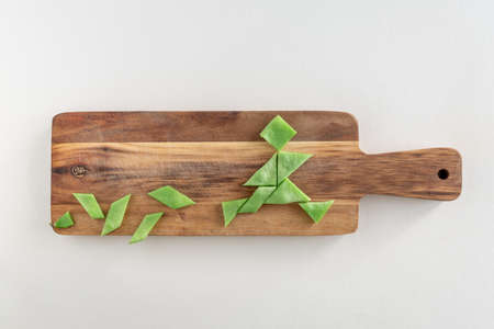 funny image of runner beans on a cutting board in the shape of a person running away, food photography, conceptual, running away from something, funny image of runner beans on a cutting board