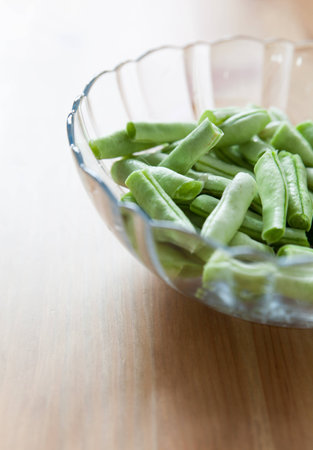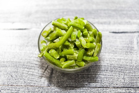Frozen beans. Glass bowl with frozen green beans on beautiful wooden background. food