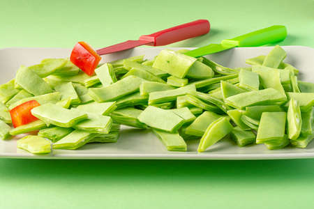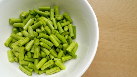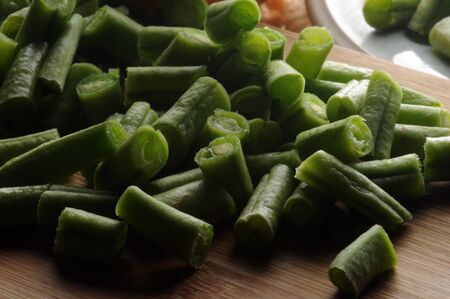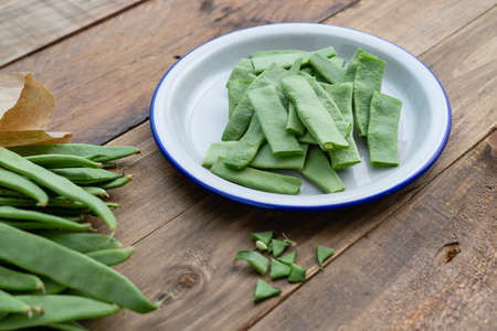Cut green beans on a plate on a rustic wooden background. Food preparation.