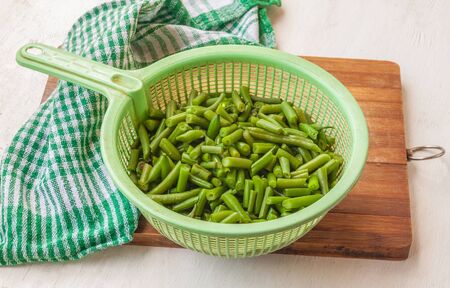 Colander with leguminous of green raw beans on the cutting board on the kitchen table