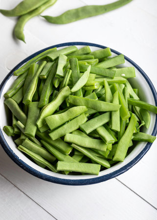 Fresh green beans in a bowl on a white wooden table. Bowl of green beans on wooden background.
