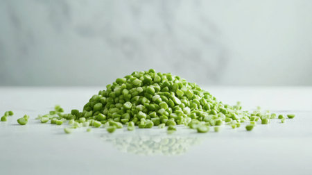 A vibrant heap of fresh green peas showcased on a smooth surface, emphasizing their natural beauty and healthy attributes in soft lighting.