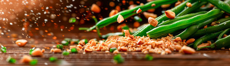Fresh Green Organic Okra with Falling Water Drops and Split Lentils on a Rustic Wooden Table Background AI Generative