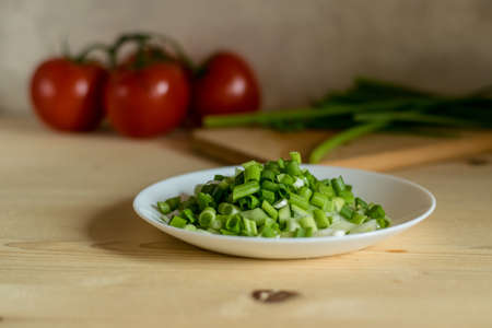 Cut green onion on the light brown wooden board background. Macro image, selective soft focus