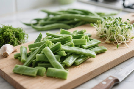 Fresh green beans on wooden cutting board with knife and garlic on kitchen table