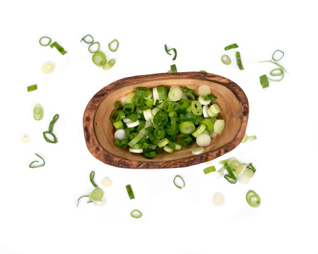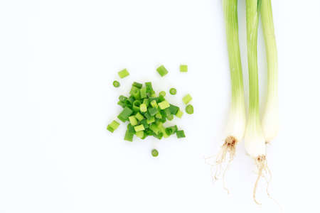 Chopped green onion on wooden Board, knife on white isolated background, healthy organic food concept.