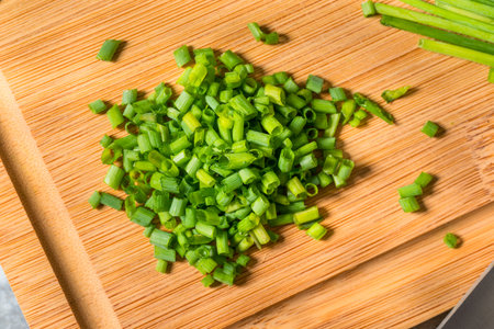 Organic Cut Green Onion Scallions on a Wooden Board, top view.