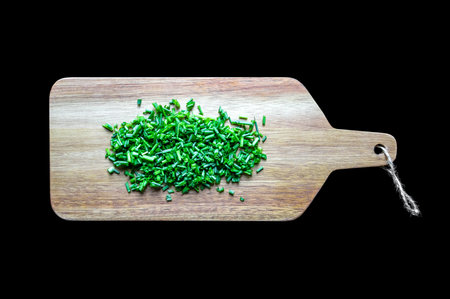 Green onion stalks cut into pieces on a wooden board. A heap of chopped green onions on a black isolated studio background. Seasonal greens, seasoning, spice for fresh vegetable salad. Macro shot.