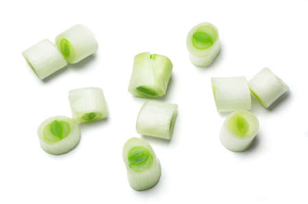 Sliced fresh green onion deep frozen, isolated on white backgrou