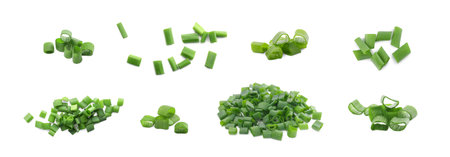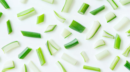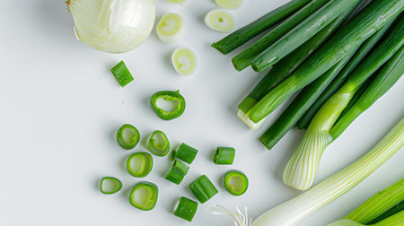 Vibrant and freshly chopped green onions scattered on a clean white background, perfect for culinary uses in recipes, garnishes, and healthy dishes.