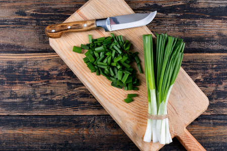 Top view spring onions or scallions on cutting board with knife, chopped up onions on dark wooden background. horizontal