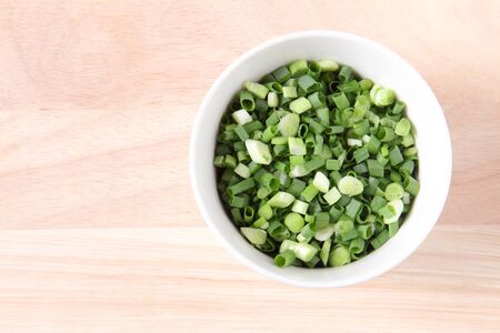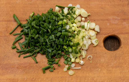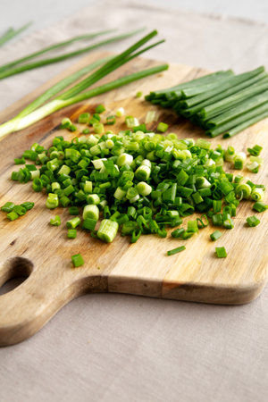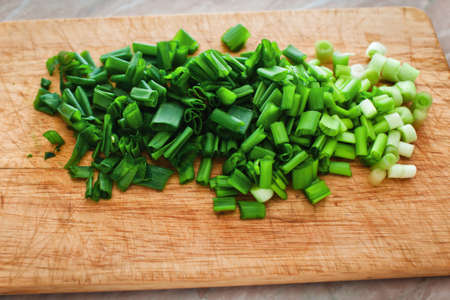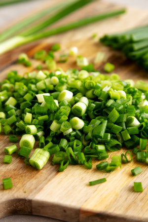 Scallion, fresh green onions sliced on a wooden cutting board. Organic food ingredient