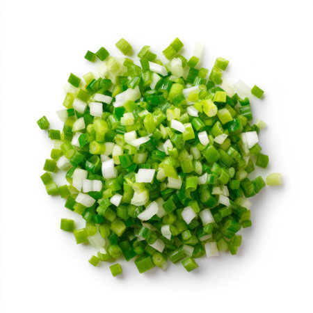 This image showcases a vibrant pile of freshly chopped green vegetables arranged neatly on a clean white background, perfect for culinary inspirations.