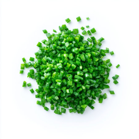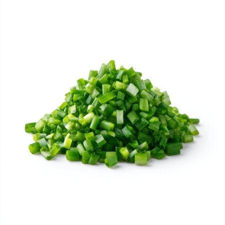 A vibrant, fresh heap of chopped green chives displayed on a clean white background, ideal for culinary design, cooking inspiration, or healthy meal preparation.