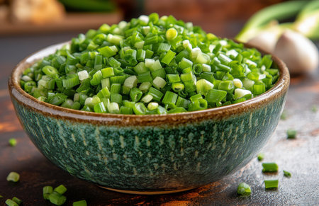 Chopped green onions are displayed in a rustic bowl with a textured surface. They are vibrant and fresh, providing flavor to various culinary dishes.