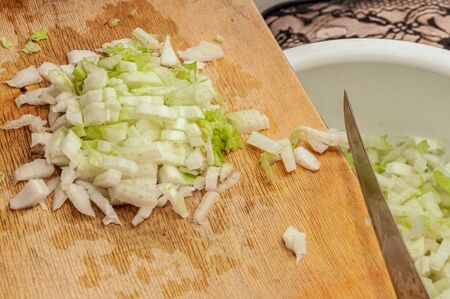 finely chopped Chinese cabbage raked from a wooden board in a plastic bowl