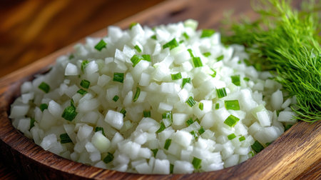 Chopped onions and fresh herbs rest on a wooden surface, waiting to enhance a dish.