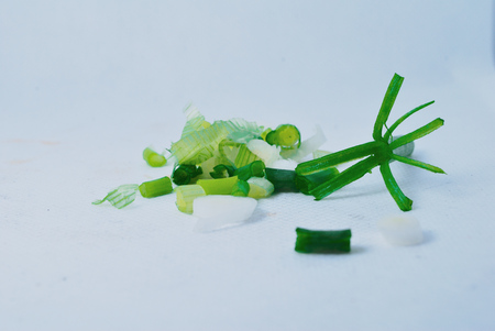simple food ingredients concept, fresh spring onion getting chopped on cuttin boards