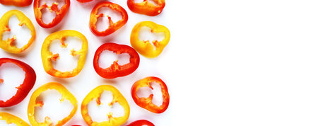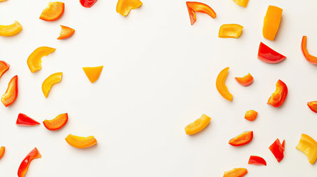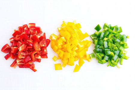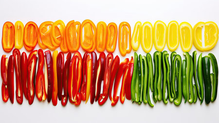 Vibrant and colorful sliced peppers arranged artistically on a white background. Ideal for culinary themes, nutrition, and healthy cooking concepts.
