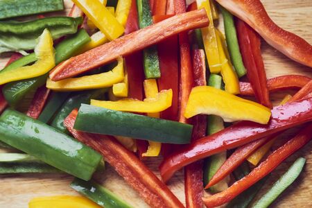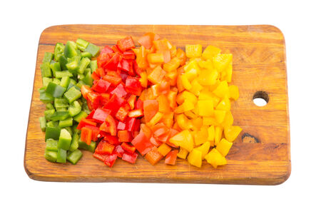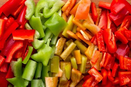 Chopped colorful bell peppers on a wooden cutting board. Top view.