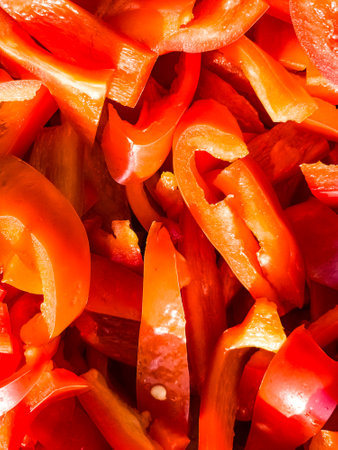 Red fresh bell pepper, sliced. Top view of red cut pepper background. Healthy food concept.