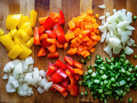 Colorful display of freshly cut vegetables ready for cooking or salad preparation. Ideal for emphasizing healthy eating and vibrant ingredients.