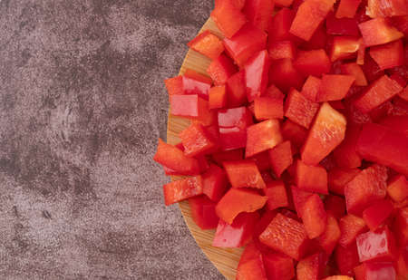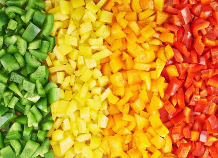Surface coated with a sweet bell pepper cut into colorful pieces composition as an abstract food background