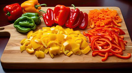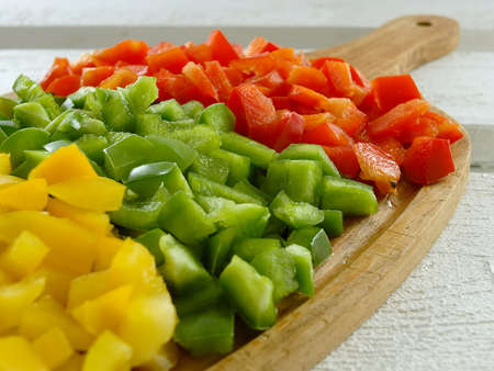 Colorful chopped capsicums wooden cutting board