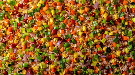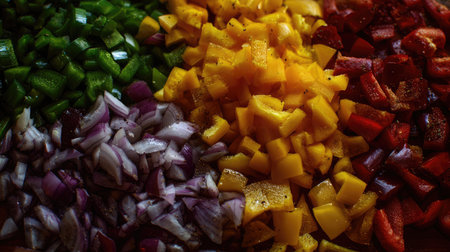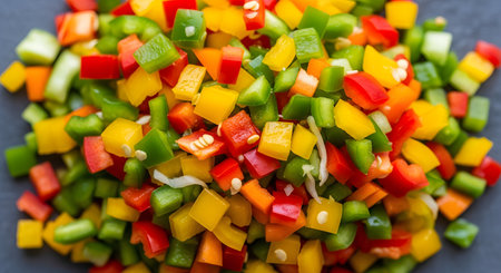 A top-down, close-up shot of a pile of freshly diced bell peppers in multiple colors, including red, green, yellow, and orange. This vibrant mix of chopped vegetables is ready for cooking, representing fresh ingredients and healthy eating.