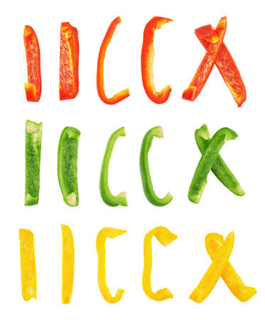 Set of sliced red, green, yellow bell pepper section pieces isolated over white background