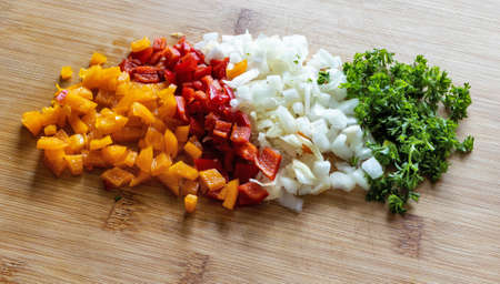 Bunch of chopped vegetables peppers, onions and parsley on a cutting board