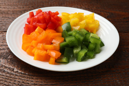 Cut colorful bell peppers on wooden table, closeup