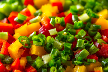 A vibrant mix of cubed red, yellow, and orange peppers paired with freshly chopped green onions, creating a lively, fresh presentation ideal for salads or garnishes.
