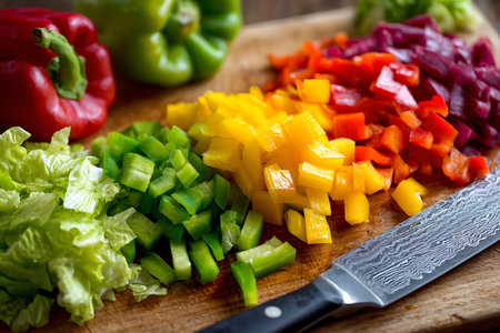 A close-up shot shows a wooden cutting board with various colorful bell peppers and lettuce that have been chopped into small pieces. The vegetables are arranged in distinct piles, showcasing vibrant red, green, yellow, orange, and purple hues. A portion of a red and a green bell pepper are visible whole on the left side. A sharp knife with a patterned blade lies on the right side of the board, suggesting active food preparation. The background is softly blurred, focusing attention on the...