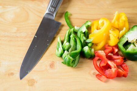 Sliced green yellow and red bell peppers with knife on wooden background, food ingredient