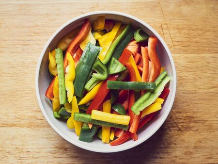 sliced red peppers in a white bowl on a rustic wooden background with copy space, preparing vegetables for cooking, top view from above, selected focus
