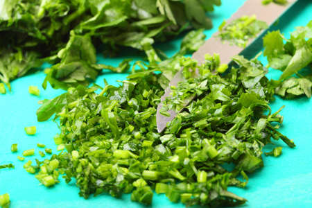 Close-up captures fresh, chopped greens and a knife on a wooden cutting board. The image highlights food preparation with sharp ingredients.