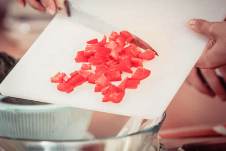 Healthy eating, vegetarian food, cooking, dieting and people concept. Woman in kitchen at home preparing fresh salad slicing vegetables throwing red pepper into bowl