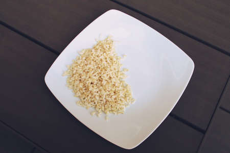 A plate of boiled brown rice. Cooked rice served on a white plate.