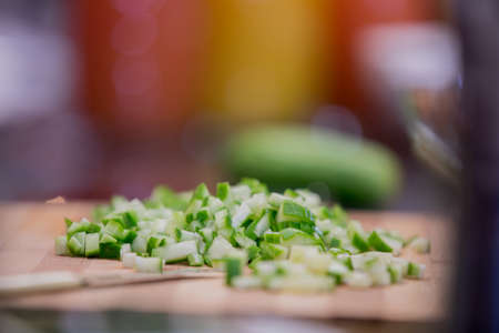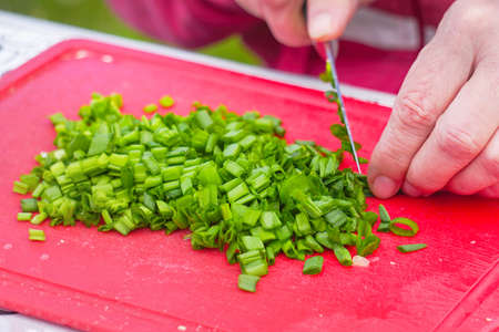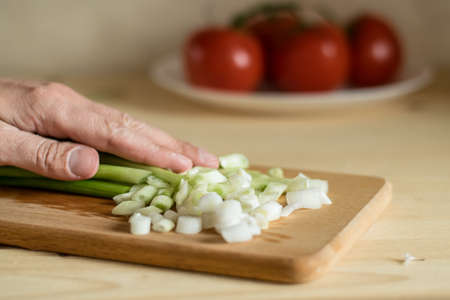 Hands of cheaf cutting a green onion. A chopped green onions on a wooden board with a knife.