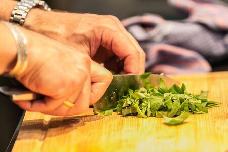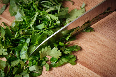 Chef holding a knife, cutting parsley on a wooden cutting board